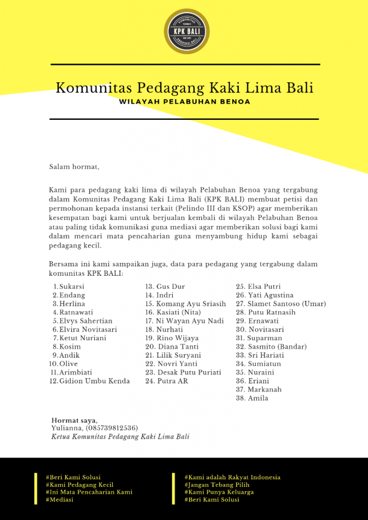 Denpasar, Porosinformatif | Buntut pelarangan pihak Pelindo III terhadap pedagang kaki lima di daerah Pelabuhan Benoa, semakin menambah kegalauan para pedagang yang tergabung dalam Komunitas Pedagang Kaki Lima Bali (KPK BALI).
