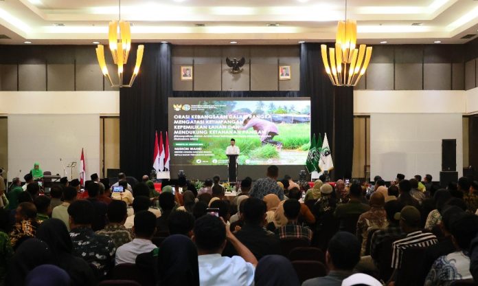 Maluku Utara, Porosinformatif| Menteri Agraria dan Tata Ruang/Kepala Badan Pertanahan Nasional (ATR/BPN), Nusron Wahid, menyampaikan orasi persahabatan dalam Rapat Koordinasi (Rakor) Korps Regional Alumni Himpunan Mahasiswa Islam (KAHMI), di Kota Ternate, Sabtu (23/08/2025).